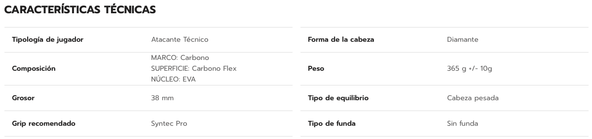 ¿Quieres jugar con una pala de carbono pero siempre te resulta muy dura? ¿No consigues optimizar la explosividad del carbono? Para ayudarte, hemos desarrollado esta pala con la tecnología única CARBON FLEX. Pruébala y descubrirás una sensación completamente nueva llamada potencia dinámica. Ahora tú también puedes beneficiarte de la potencia del carbono.